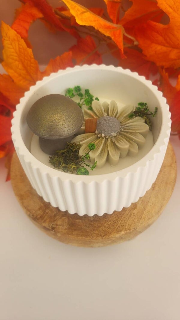 Apportez une touche naturelle et poétique à votre intérieur avec ce socle en RaySin 200 (5 cm de hauteur × 11 cm de diamètre), mettant en scène un champignon délicat, sa fleur et des fleurs séchées, harmonieusement disposés dans des tons verts et gris.