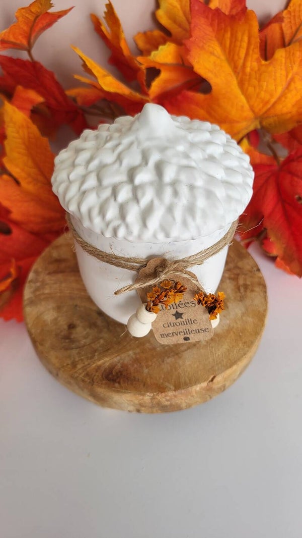 Apportez une touche chaleureuse et poétique à votre intérieur avec ce socle en forme de gland fait en raysin200, abritant une bougie décorée de fleurs séchées au senteur de citrouille merveilleuse.
